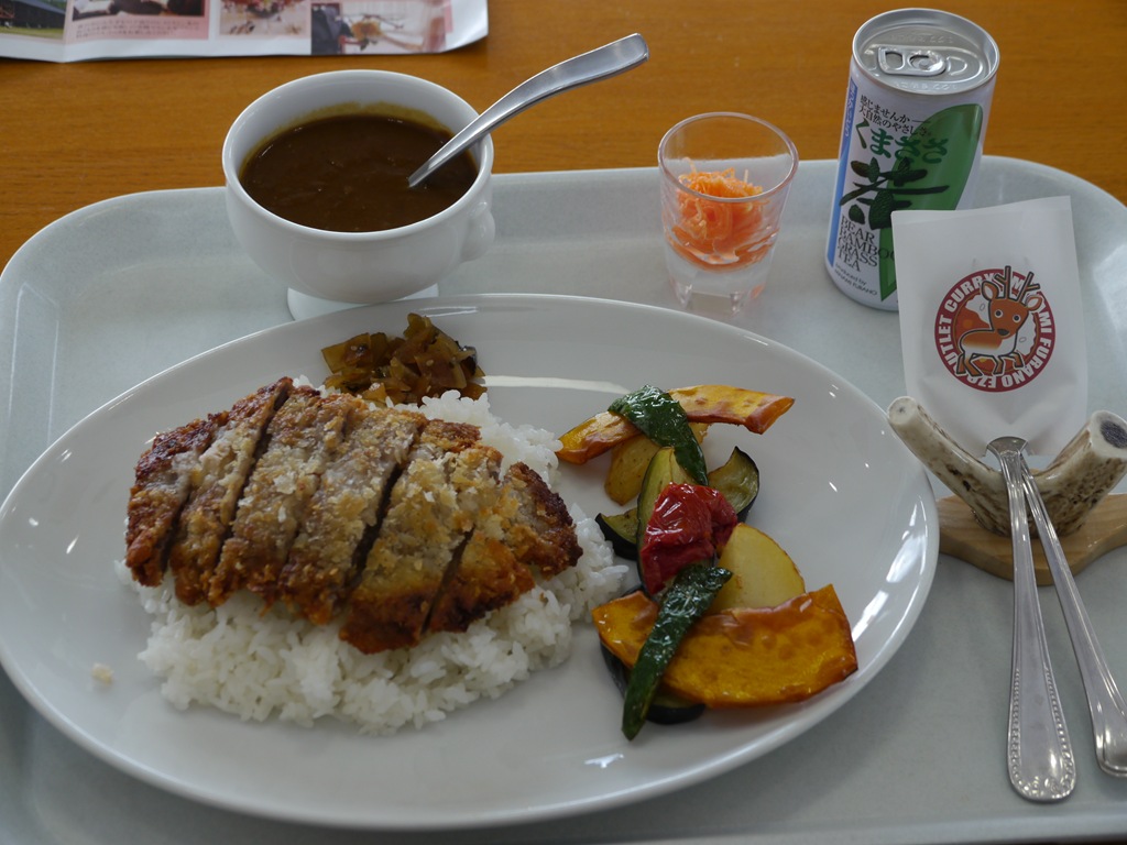 名物の南富良野エゾシカカレー950円をいただきました。素揚げした野菜も色鮮やか、エゾシカのかつそのままルーをかけないで食べましたが、とても上質なお肉のおいしさ。人参のマリネやくまざさ茶もついていて、なかなか豪華です。レストランの味のおいしいカレールーをたっぷりかけていただきました。箸置きも鹿の角、南富良野の名産のクマザサ茶もついていて