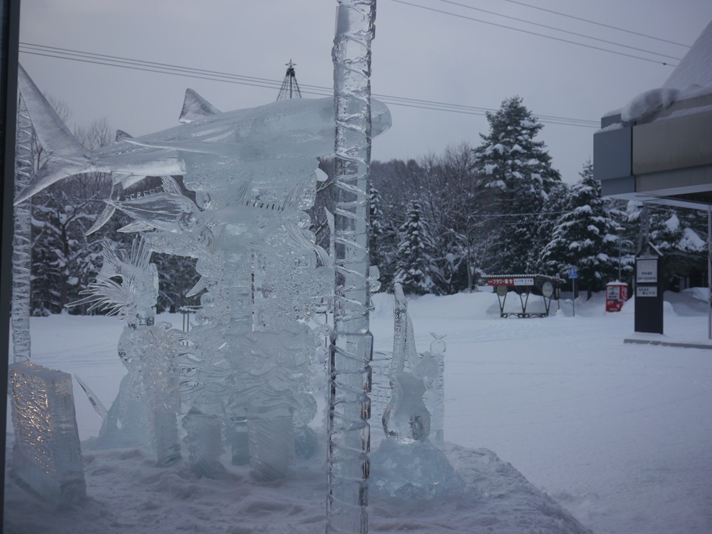 札幌から車で2時間半、久しぶりに芦別温泉星遊館へ、温泉に入る前にスターライトホテルで食事をとりました。テーブルから見事な氷像が見えます。