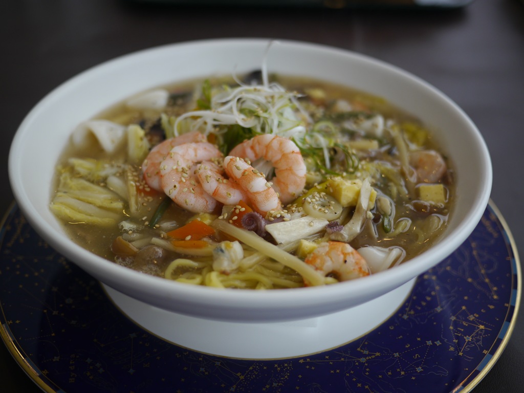 いただいたのは、芦別名物のガタタンラーメン、10種類以上の具材がちょっとあんかけ風の塩味スープに太めの麺がよくからんで美味しい。季節のガタタンラーメンや石炭ラーメンもあって迷いましたが、定番のガタタンをいただきました。ラーメンの受け皿きれいな星のデザインで豪華なお皿