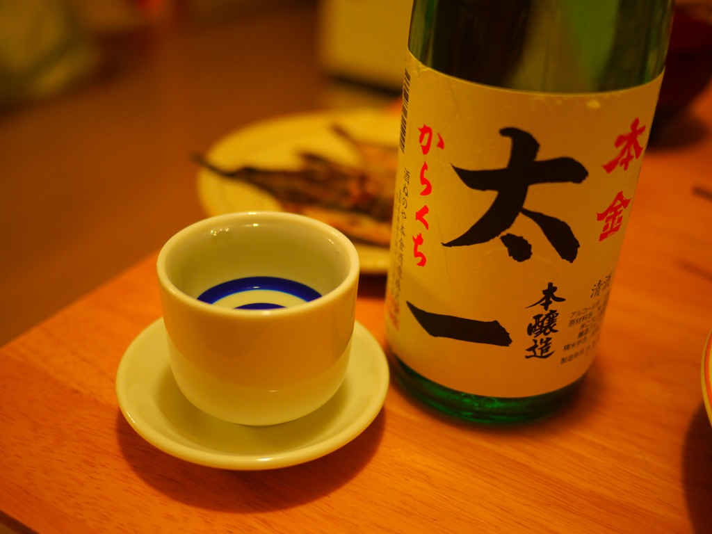 本金本醸造太一 旬の柳葉魚とともにさっそく家で飲みました。辛口のきりっとしていながらもふくよかなお米のうまみ、バランスのいいおいしいお酒、ご主人が言うようにこれはいいお酒と思いました。おまけに900円とお財布に優しくてうれしいお酒です。