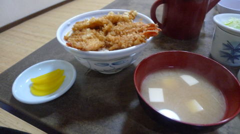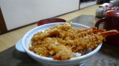天ぷらは東京浅草で食べたような、汁をよく吸った衣です。海老が4本、烏賊が1つと見た目にも豪華な内容に、ちょうどよい甘さの天つゆがごはんにたっぷりかかっていておいしい天丼です。しっかりした味が、室蘭で働いていた人たちに愛されたのだろうと思いました。