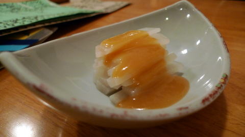 1月末の土曜日開店時間に味百仙にお邪魔しました。栗山の小林酒造でおいしい日本酒をたくさんごちそうになった後でしたが、メニューの冬花火をみつけて、最初にたのみました。