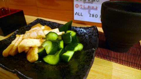 自家製のおしんこ盛り合わせ 通常3種類のところこの日は2種ということで安くしていただきました。きゅうりも長芋も、塩がきつくなくて、ちょうど身体にいい味付けです。