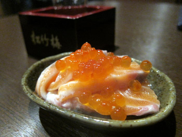 お通しはいくらとサーモンです。日本酒によくあっておいしくいただきました。