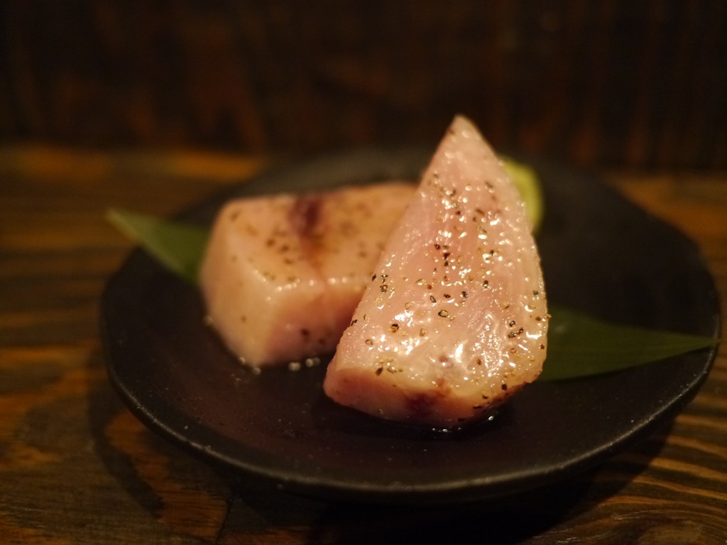 店長さんに目の前の七輪で丁寧にマグロを焼いてもらいお皿の上に、おいしい脂がたっぷりお醤油でいただきます。炭火で焼いた香ばしさがすばらしい。