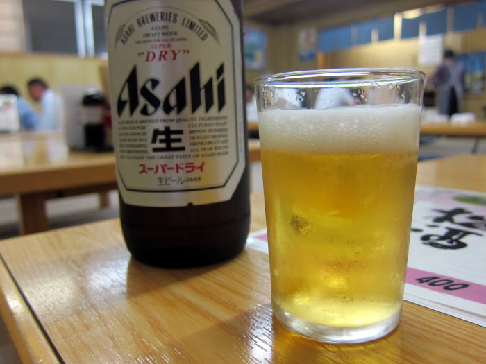 いつもはカウンタで食べるのですが、この日は奥の座敷にどうぞということで、座布団に座ってビールをお願いしました。大瓶のスーパドライきりっと冷えていておいしい。