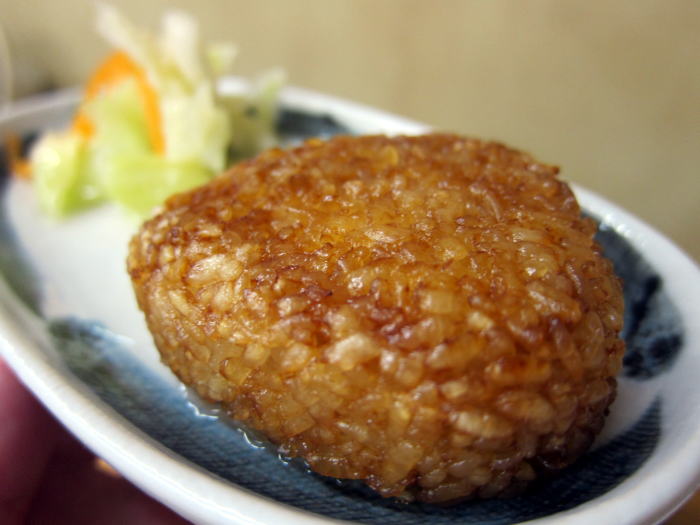 メニューにはなかったのですが、お米がたべたくなって、おにぎりをお願いすると、焼きおにぎりならできますよということで、時間をかけてこんがり焼いてくれました。表面かりかりの焼きおにぎりで、おしんこもついてます。