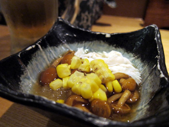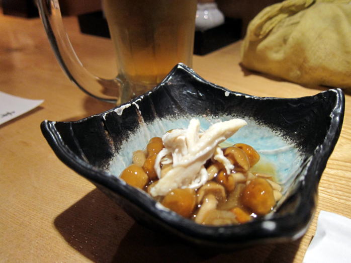 まずはお通しが登場です。なめこおろしの上にのった、ササミとコーンの食感も楽しめるおいしい一皿です。