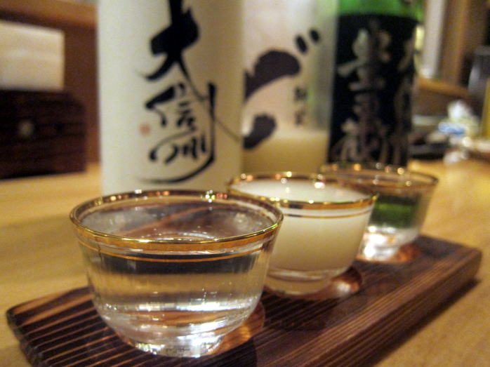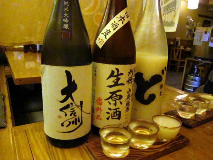 利き酒セットをお願いしました。3杯で1合以上あってお得感があります。この日は大信州大吟醸、秋田のどぶろくの「ど」、大信州の豊野蔵の3つがおちょこにたっぷりとそそがれました。