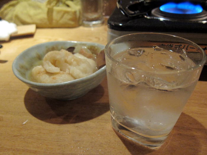 この日は、昼間の暑さにかなりやられたあと、友人と中華をおなかいっぱい食べた後の訪問でした。おいしい料理を出してくれるマスターには申し訳ないことに満腹で、苦しくてマスターに、わがままを言っておなかがすっきりするお酒をお願いしたところ、グレープフルーツを搾り、アセロラジュースとブレンドした焼酎割りを丁寧に作っていただきました。1:1:1の豪華なカクテルで、飲んでさっぱりすっきりとおなかの調子がよくなりました。後で、とてもありがたい気持ちになりました。
