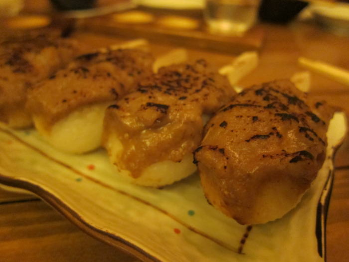刈穂の隣には、のどか自家製の焼ききりたんぽです。さすが秋田の観光大使のお店、きりたんぽもあきたこまちをお店で丁寧に半殺しにして杉の木につけて炭火で焼いてだしてくれます。秋田では家ごとに味噌の味に特徴がありますが、のどかのこの日の味噌は蕗味噌で苦みと甘みが絶妙でお酒にあいました。