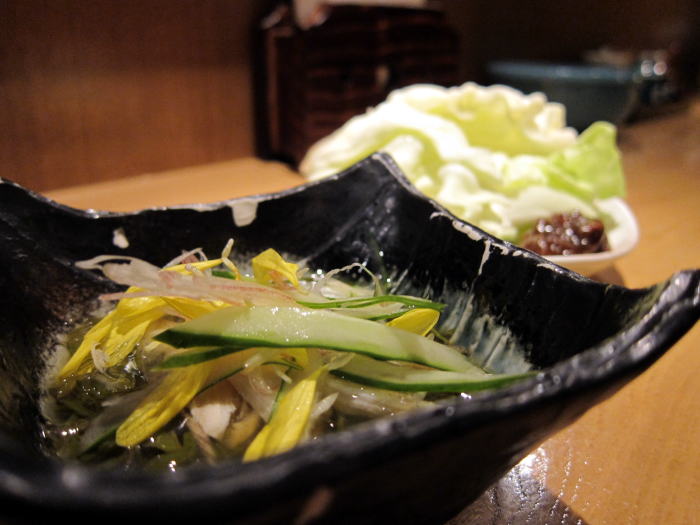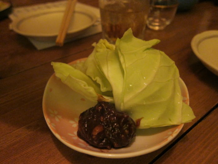 おとうしのじゅんさいの酢の物、菊の花やみょうが、きゅうり、夏のおいしい野菜もいろどりよく入ったおいしい1品です。さらに、メールマガジンに登録しているとサービスのキャベツ味噌がでてきます。しゃきしゃきの新鮮なキャベツにのどか特製の味噌がとてもおいしい一皿です。