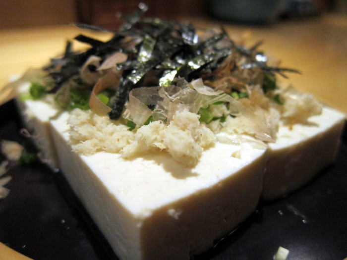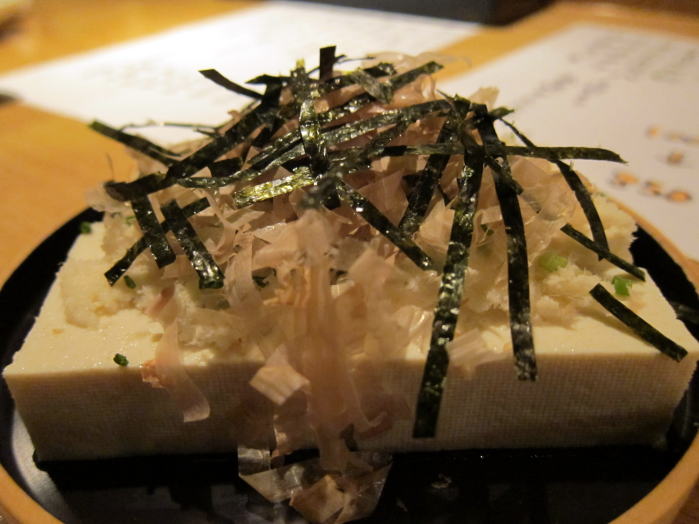 山わさびのせ冷や奴 選べるおつまみの一品目 つんとさわやかな山わさびの辛さと冷たい豆腐がビールにあいました。