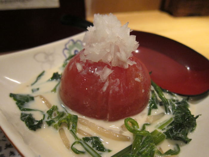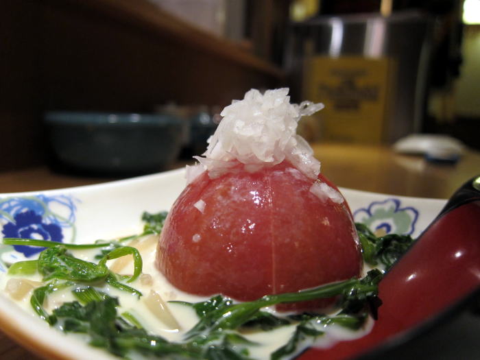 豆乳漬け冷やしトマト 選べるおつまみの二品目 これまた、夏らしいおつまみです。冷えた豆乳はうまみたっぷりで、トマトと良く合うおいしい料理でした。
