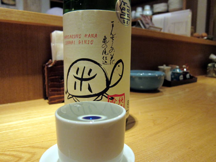 まんさくの花 亀の尾仕込み純米吟醸生原酒 瓶の上には大きく限定品と書かれたラベルがはられた、亀の甲羅に米の字がかかれた何とも楽しいラベルです。