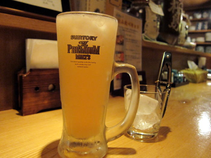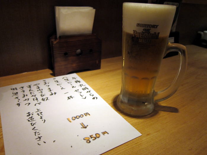 21時すぎに友人と訪ねて、午後9時からの生ビールセットをお願いしました。生ビールとおつまみ一品で850円という、ちょっと遅めの時間帯の晩酌セットのような企画です。アイディア豊富なマスターの佐藤さん料理もおいしいですが、いろいろな企画も楽しませてくれます。生ビールはうれしいことにプレミアムモルツです。