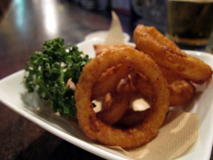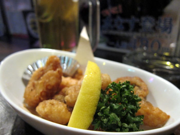 オニオンフライリングはかなり高温で揚げているようでぱりっとしています。たこザンギもおいしかったですが、揚げたてフライとビールの相性はぴったりでした。