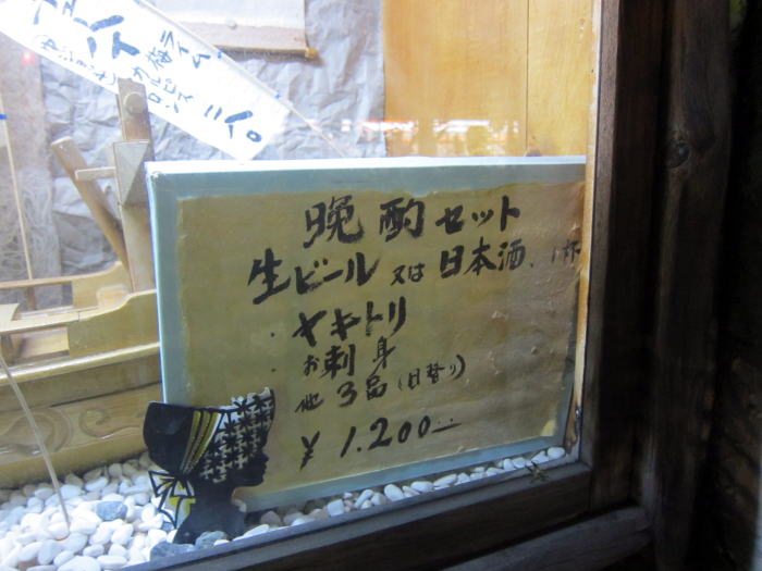 ドアを開ける前に目がとまったのは、何とも上品なディスプレイの晩酌セットの文字です。何時までという表示がないので、入って「晩酌セットまだいいですか」と聞くと大丈夫ですよと安心する返事でまずはカウンタの端に落ち着きました。