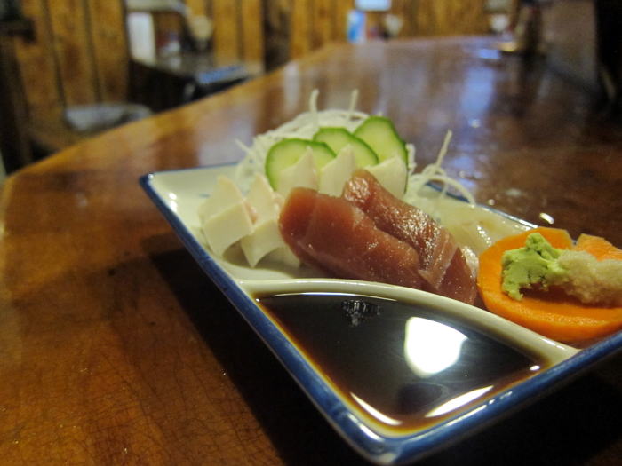 小皿をながめているうちに運ばれてきたのは晩酌セットのお刺身です。なんとたこにまぐろにいかと三品ものっていて驚きました。