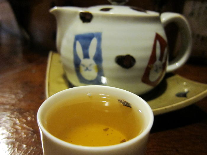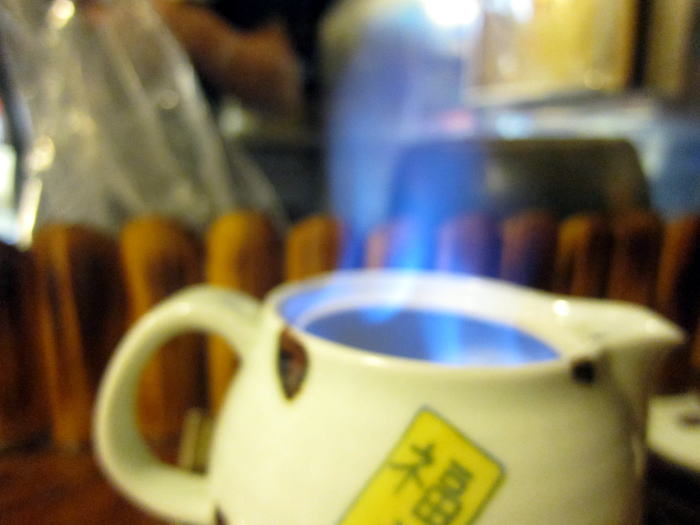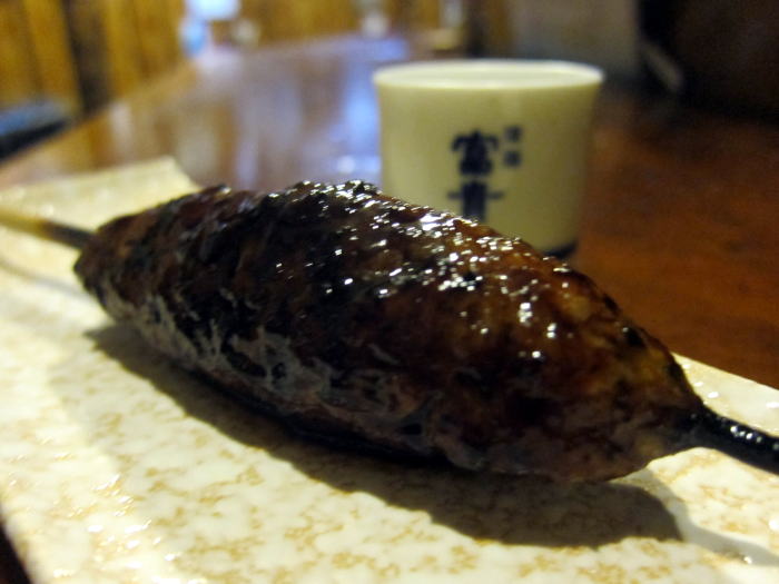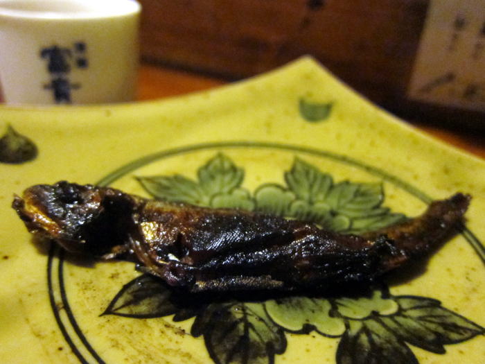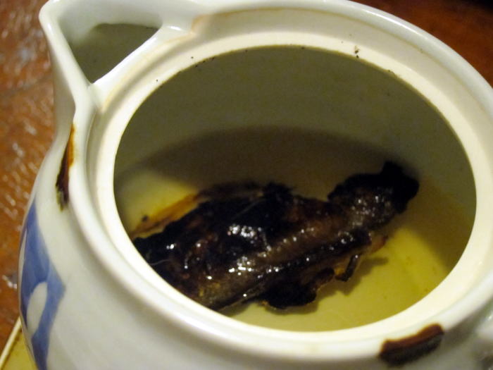 富貴を熱燗にして、炭火であぶったヤマベを入れて、目の前で火をつけてくれました。お酒は1合のきつねかんと1.8合のたぬきかんがありました。たぬきかんに入れてもらいました。