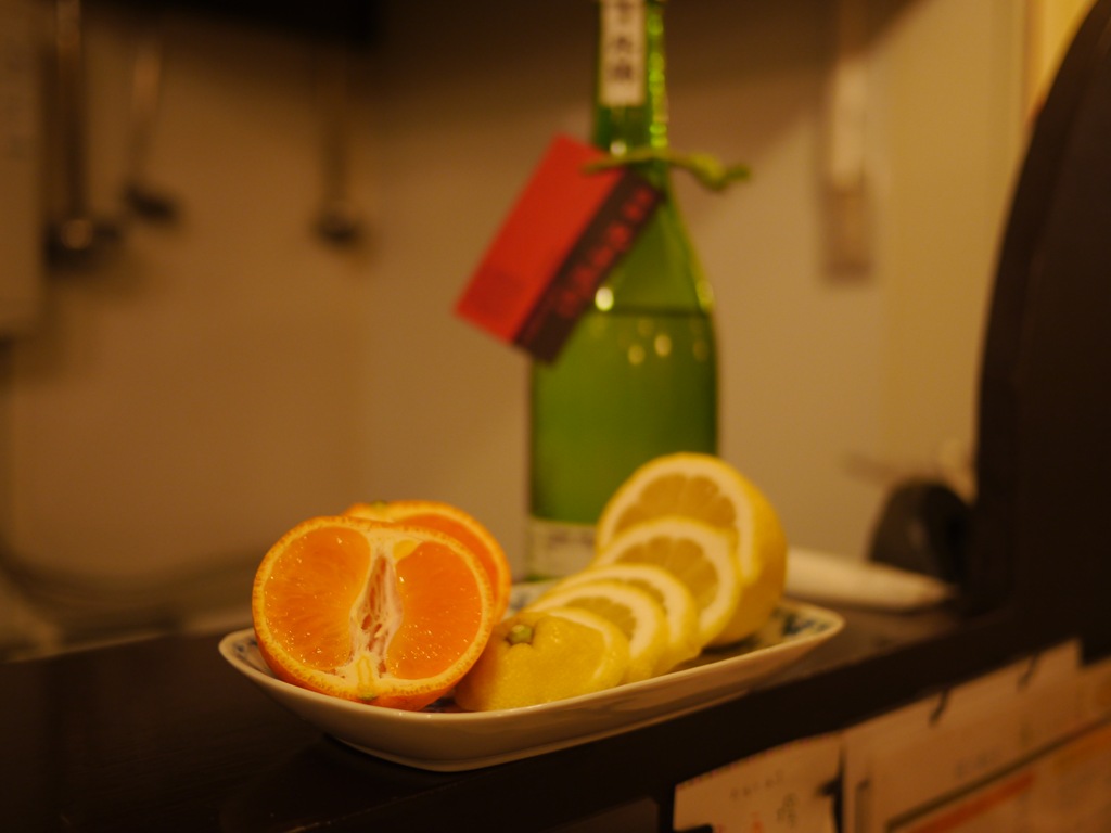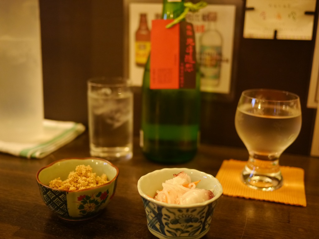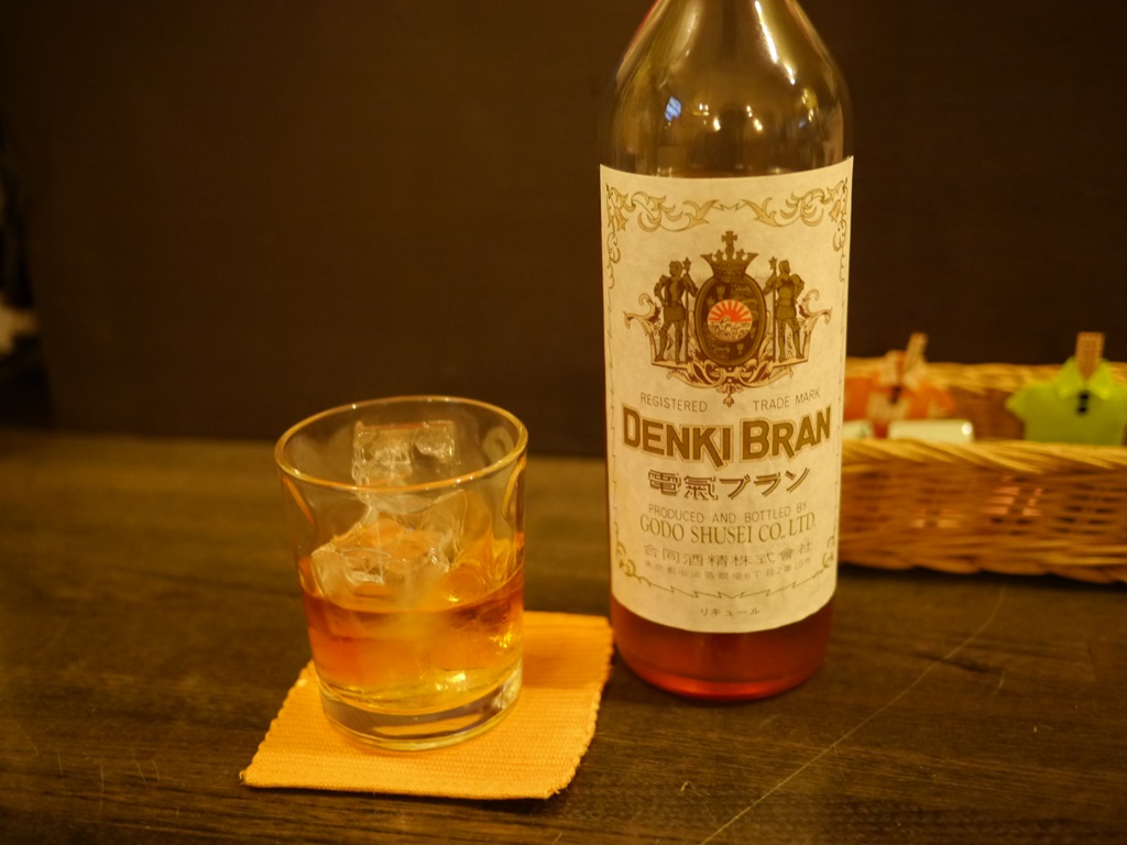 最初の一杯何を飲もうかと迷っていると、ご常連が飲んでいた電気ブランをおすそ分けしていただくことになりました。この電気ブラン、40度と、少しアルコール度数が高めです。養命酒を思い出すような身体に良さそうな味わいです。