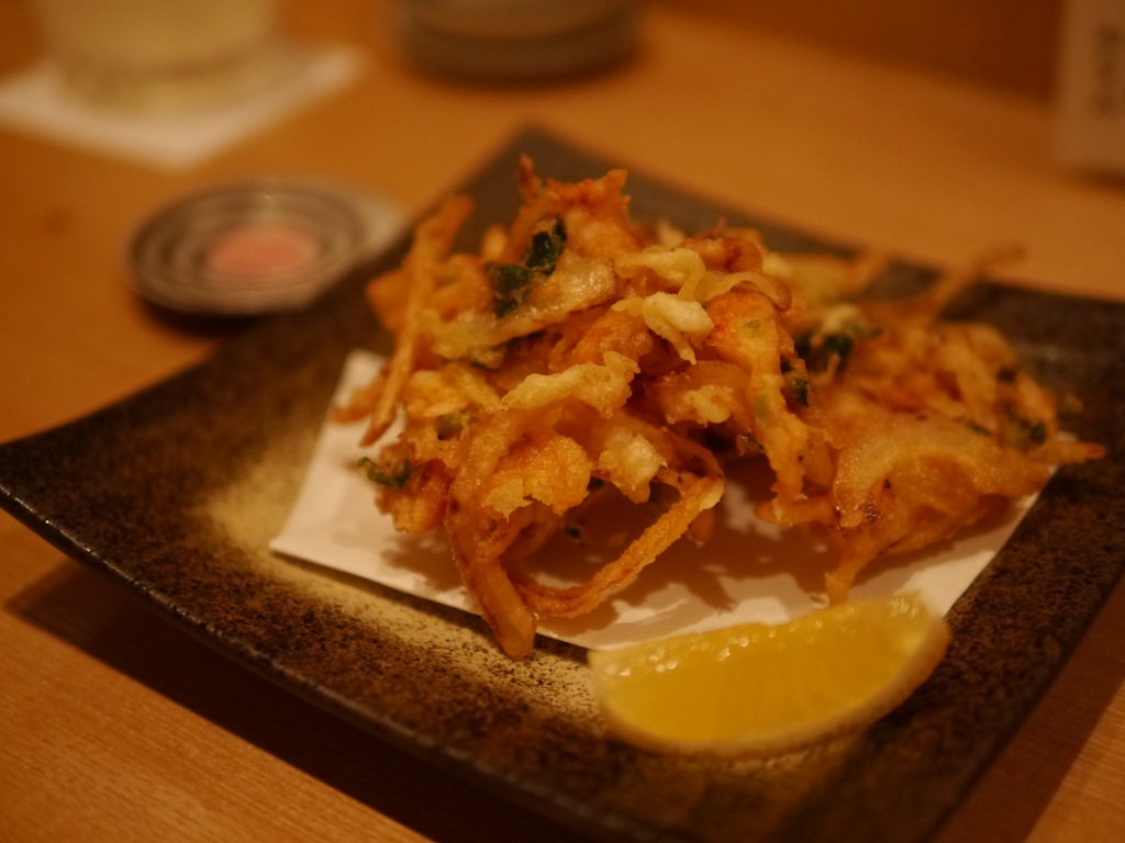 桜えびと三つ葉のかき揚げ 580円 春らしい天ぷらです。以前天ぷらをいただいて美味しかったことを思い出しました。さくっとしたおいしさが北斗随想にぴったりで、飲んでしまいました。