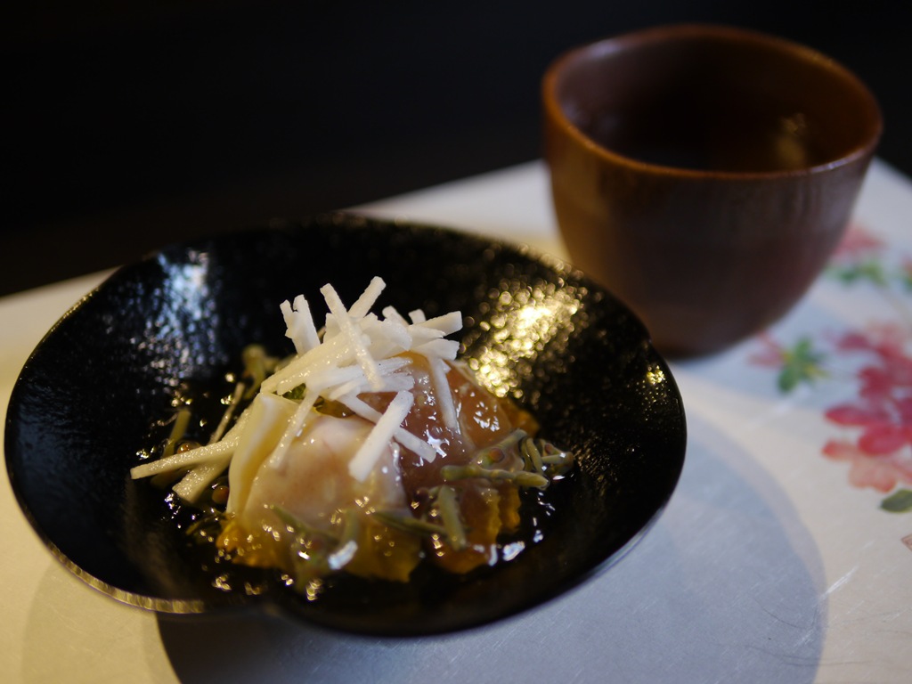 夏らしいゼリーもきれいな一皿です。白い部分軟らかくて、たこ頭と思ったらイカでした。おいしい肴にお酒がおいしくすすみます。