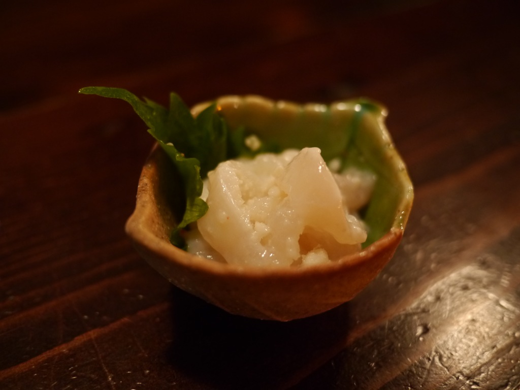 この日、余市に買い出しに行ってきたということで、新鮮な幸がいろいろ、メニューをみてぜひ食べたいと思った、余市産朝捕り南蛮エビの塩辛 500円、ぷりぷり感がうれしい、フレッシュ感のおいしい塩辛