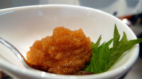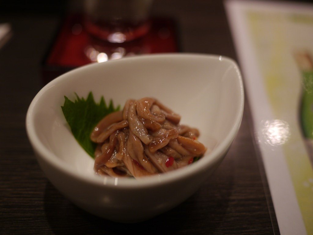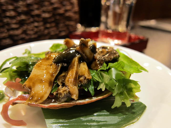 あわびの肝とあえてあり、ちょうどいい大きさに切り分けられたあわびの身は相性ぴったりの海藻の上にのっています。お酒にあうおいしい肴です。