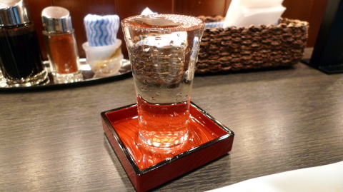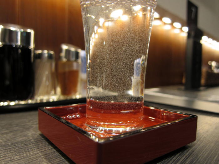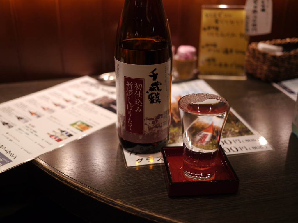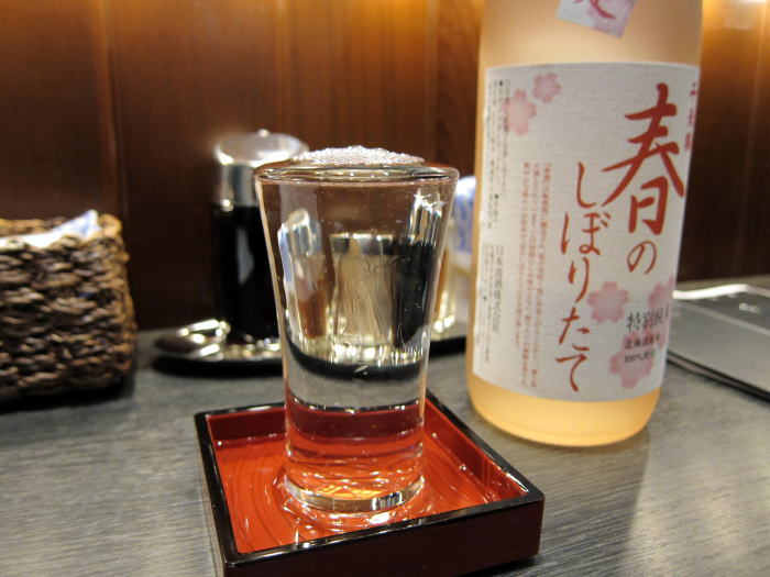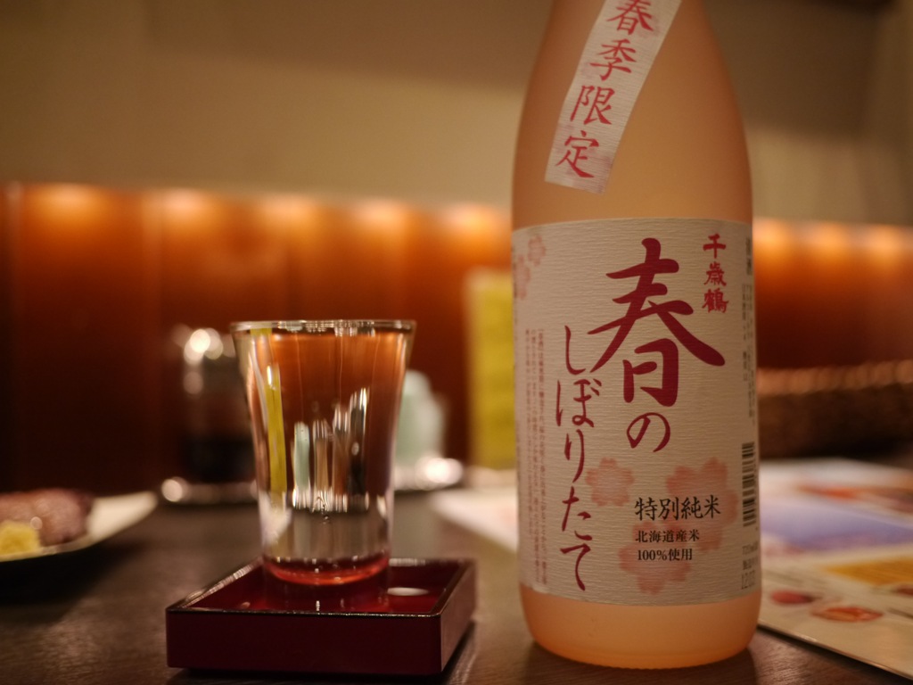 街歩きで喉が渇いて立ち寄ったのはアステイ45隣にある鶴の蔵です。今日の1杯目はいかにも春らしい「春のしぼりたて」というお酒をお願いしました。瓶に描かれた桜が春らしい気分にさせてくれます。