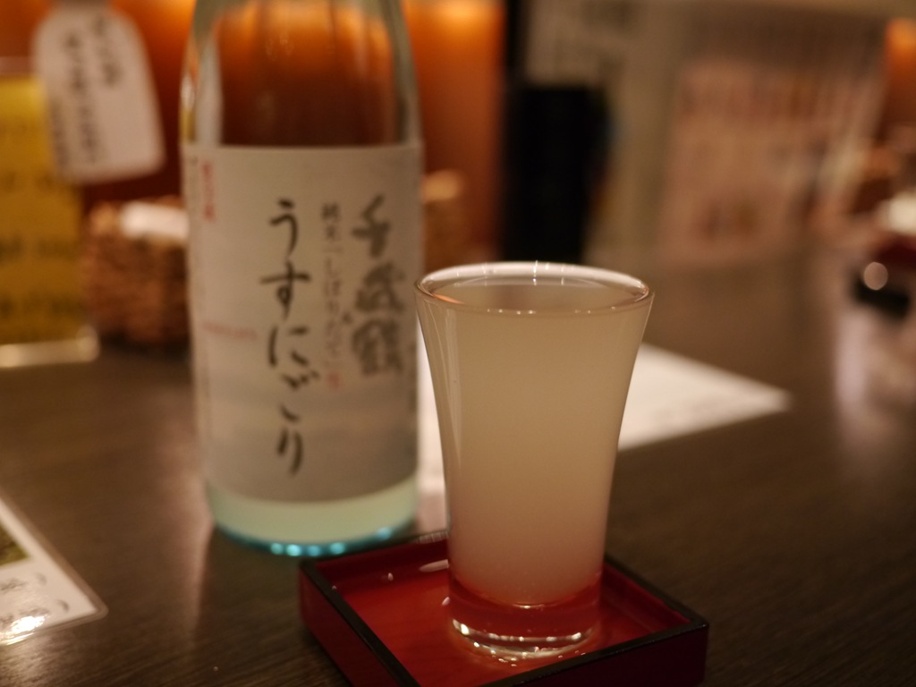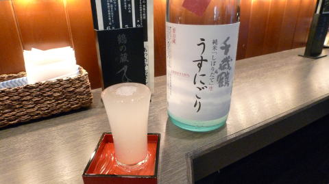 千歳鶴純米しぼりたてうすにごり380円 きれいな霞色、滓引きする前のお酒ということです。この時期のお楽しみ、フレッシュなおいしさ