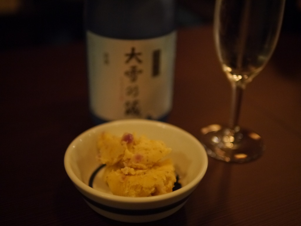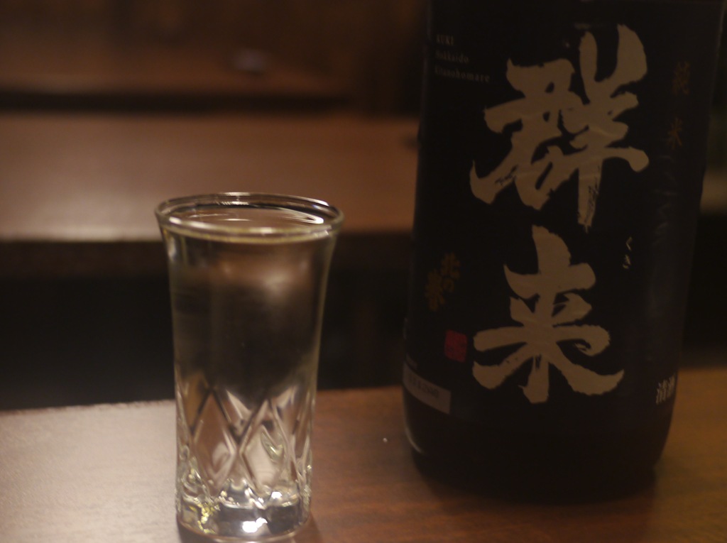 冷え込んだ外から、暖かい店内に入って一安心、一気にカメラのレンズも曇ってしまいます。最初にいただいたのは北の誉の群来、いかにも小樽の地酒らしい、すてきな名前、北海道産吟風100%のおいしいお酒