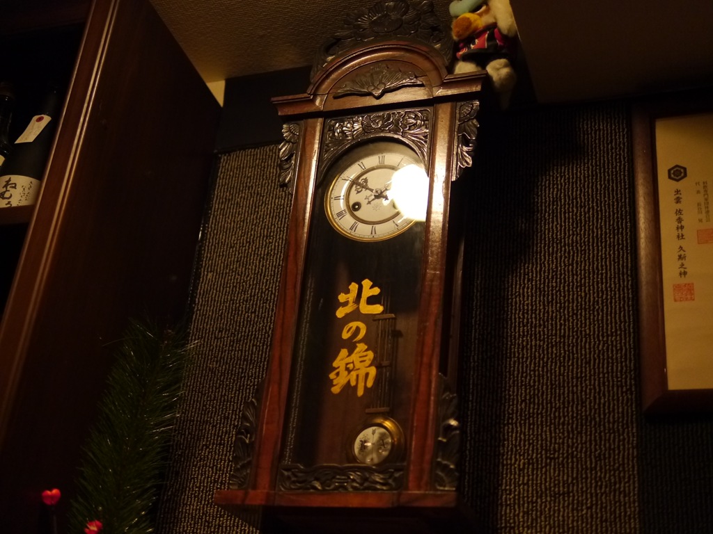 栗山から小林精志さんが大事にお店まで運んだ、今は止まった大きな古時計、みていると、頭のすみに「おじいちゃんの時計~」という歌詞が蘇ってきました。これはだいぶ酔いがまわってきているようで、家路につくことにしました。