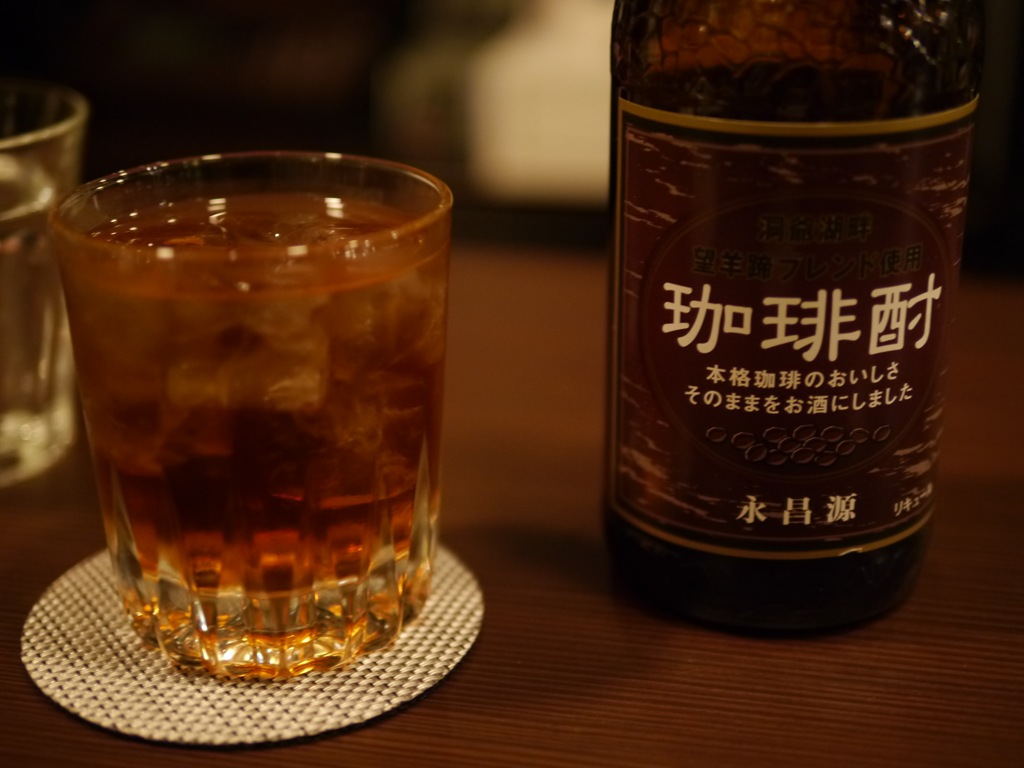 バーホッパーたのむと、お店と同じ色合いの珈琲酎、洞爺湖のレストランのブレンドコーヒーを使ったリキュールだそうです。ピリ辛のおいしい煮込みとともにいただきました。