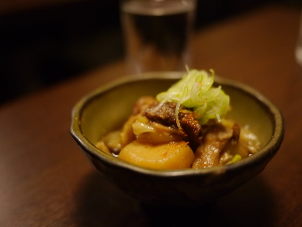 お通しのおいしいもつ煮込み、冷えたからだがあたたまりました。