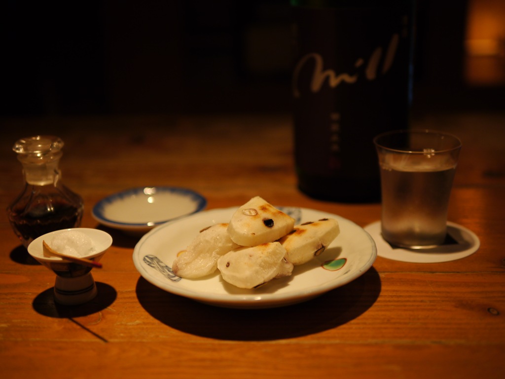 豆もち 2コ400円 明鏡止水のおともに、まめもちが食べたくなってお願いしました。砂糖醤油でいただく大好きな味、まめもちと日本酒好きな取り合わせです。