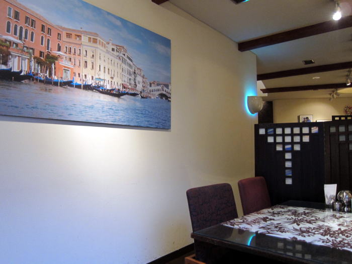 店内の壁に飾られた作品をみるときれいな美術館にいる雰囲気です。夜にはピザやパスタもいただくことができる、イタリアンレストランのような珈琲館です。前にきたときはこの場所にはクエンタシルマルリオンというレストランがあったことを思い出しました。