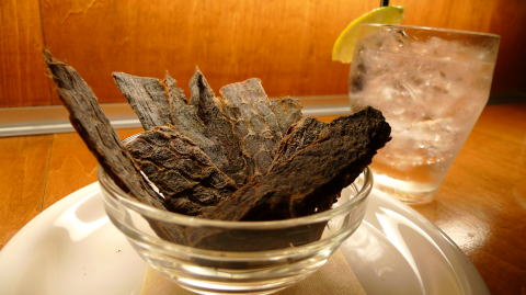 ジントニックとともに一品おつまみにビーフジャーキーをたのみました。お酒にあうのですが、つい飲み過ぎてしまうので注意が必要なおつまみです。