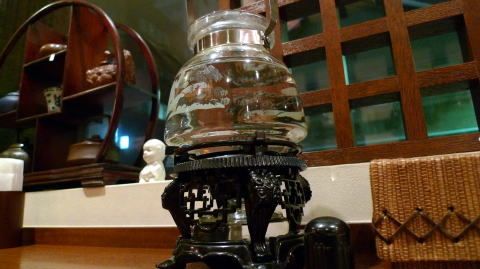 目の前のきれいな彫刻をほどこされたアルコールランプで柔らかくお湯が温められます。
