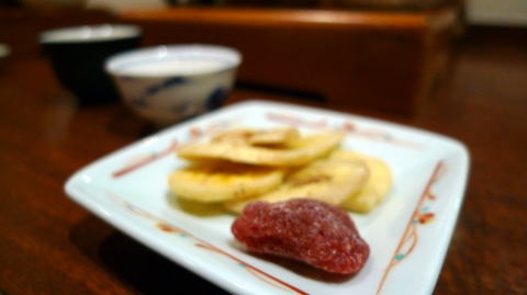 ウーロン茶のお茶うけに食べた、バナナとイチゴなかなかあいました。