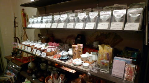 店の入り口のおみやげコーナーをみるのも楽しいです。私は自宅用にお花の工芸茶セットを買いました。