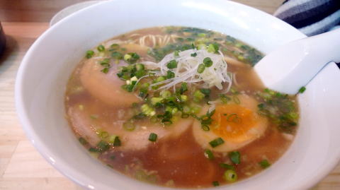 スープは煮干しのきいた魚系のあっさりとしたお味です。麺は細いストレート麺でなんとなく、関東風のラーメンという感じです。お箸もつるつるの黒い箸で細いストレート麺がすべって少し食べづらかったのですがおいしくいただきました。