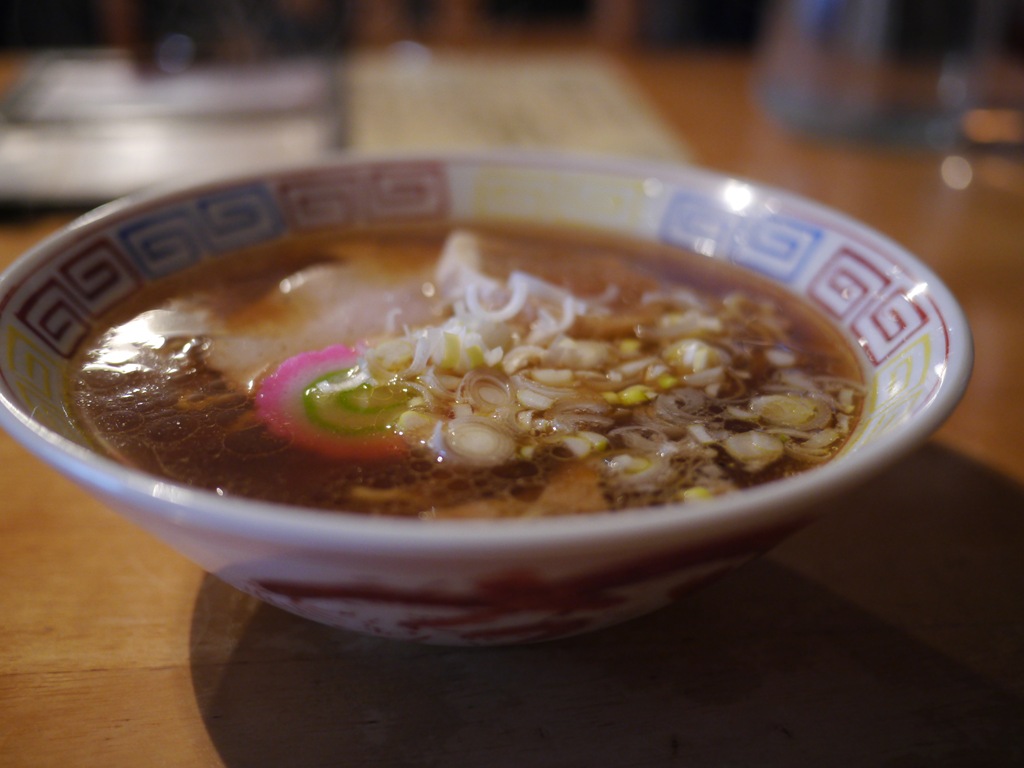 しばらくして、でてきた半ラーメンのしょう油味、とてもきれいなスープです。懐かしいおいしさ。スープまで全部飲んで満足、半ラーメンではなく普通にしておいた方がよかったと食べて思いました。まずは麺を全部食べて、後半、焼き鳥丼のスープとしていただきました。とてもおいしい