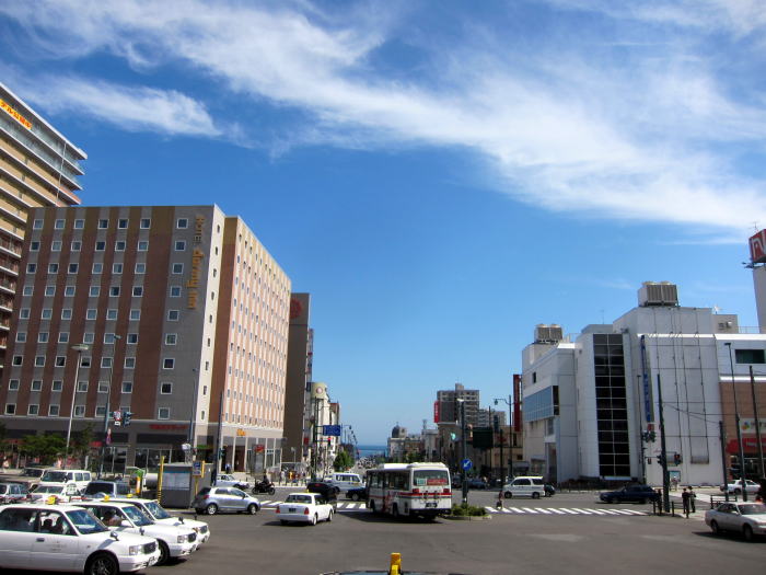 小樽駅前から港を見下ろすと、駅前通りの電線が地中に埋設されていてとても空が広く見えるようになり絶景の景色が広がっています。