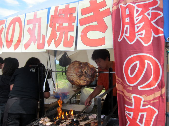 巨大な豚肉のかたまりをまわしている、豚の丸焼きも売っていました。