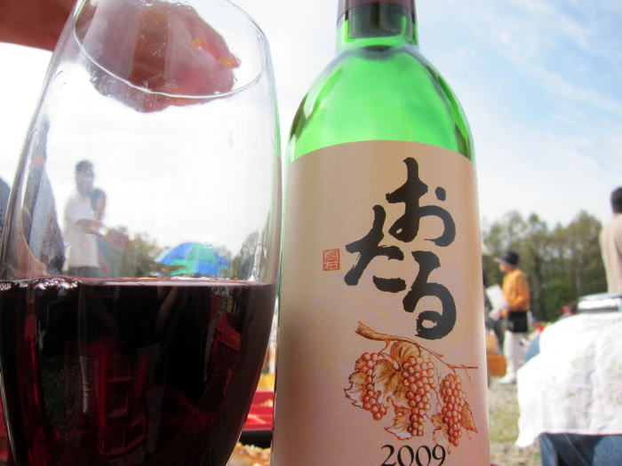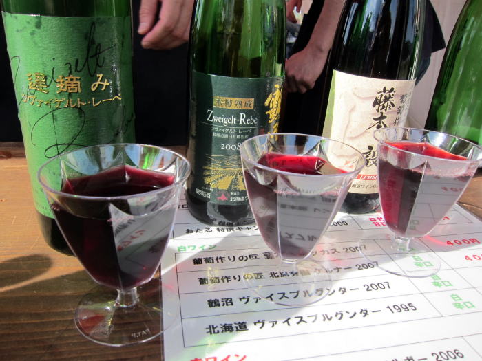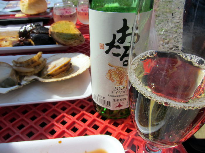 400円のワインくじをひいてワインが3本あたりました。まずは白のナイヤガラ2009をあけていただきます。