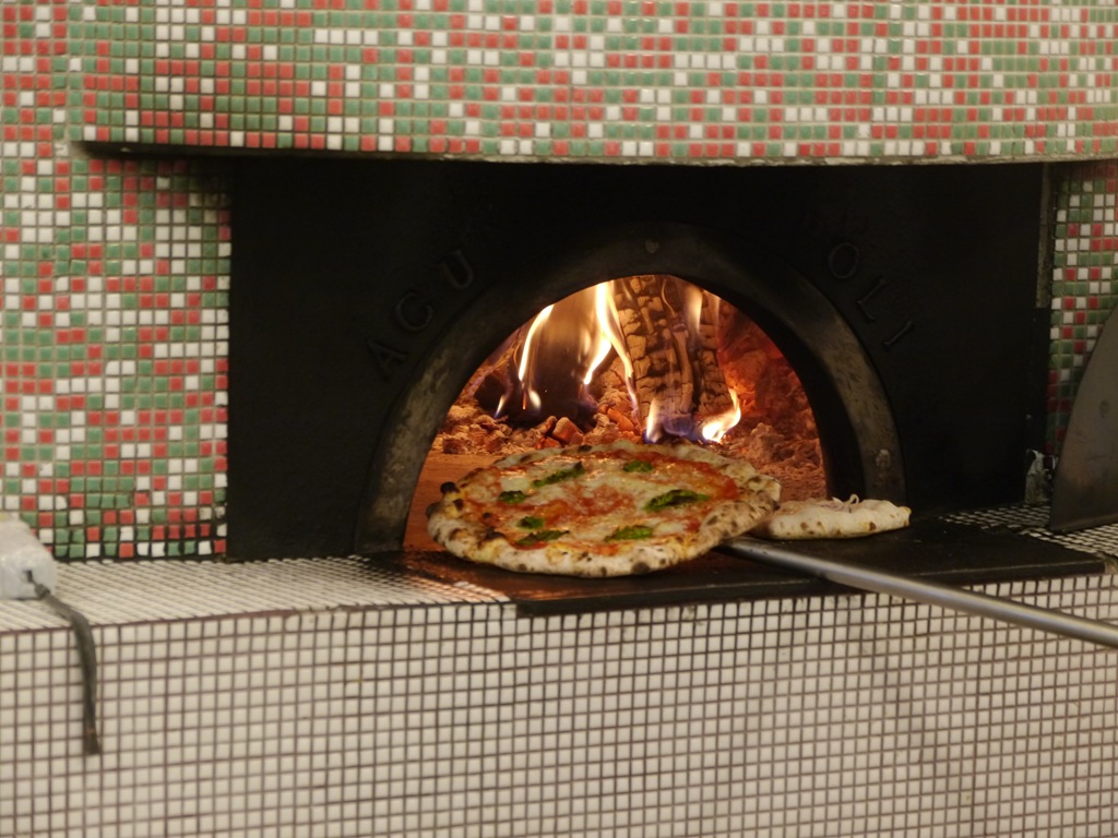 きれいなタイル張りのイタリア製のピザ窯からおいしそうなピザがでてきました。