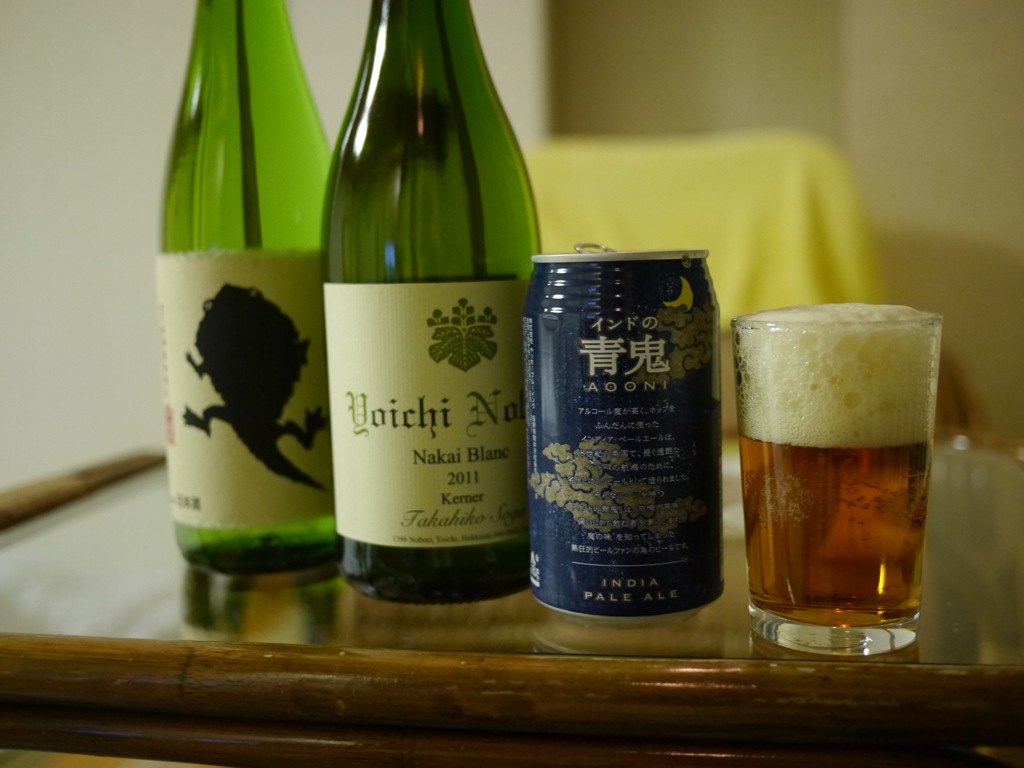 部屋で何を飲もうと今日買ったお酒を並べました。あけたのは途中のサンクスで買ったインドの青鬼