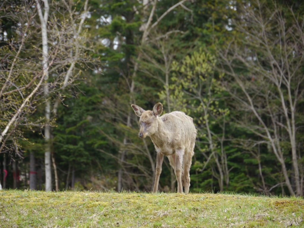 ゆったりとした時間を楽しんで、チェックアウト、昭和を感じる白金観光ホテルで、すっかり疲れがいやされました。宿を出ると目の前に鹿がいます。さすが白金温泉