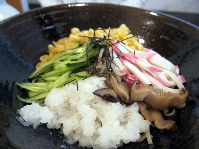 冷やしたぬき蕎麦 いろどりよくて具たくさんです。麺は細麺です。